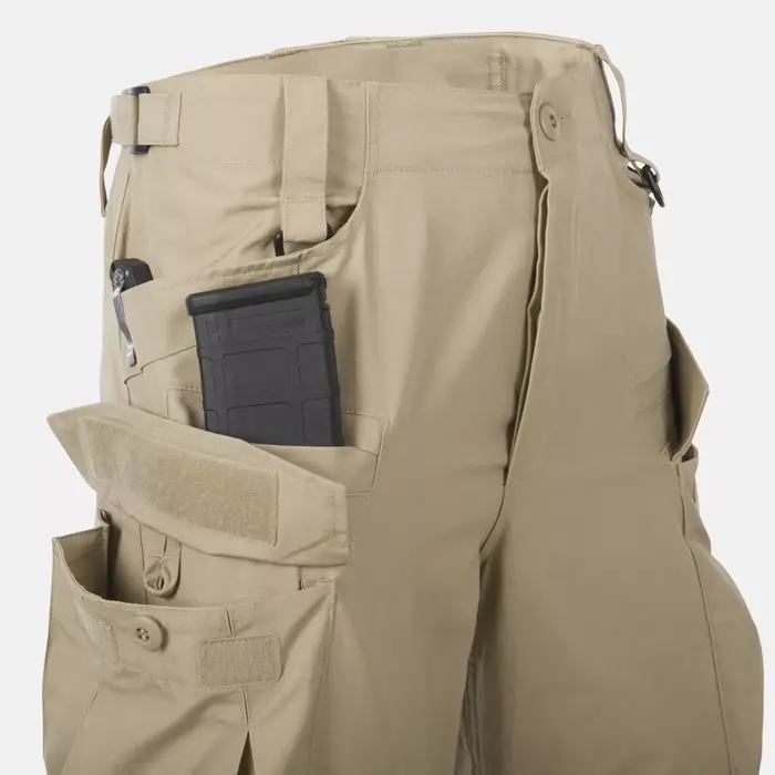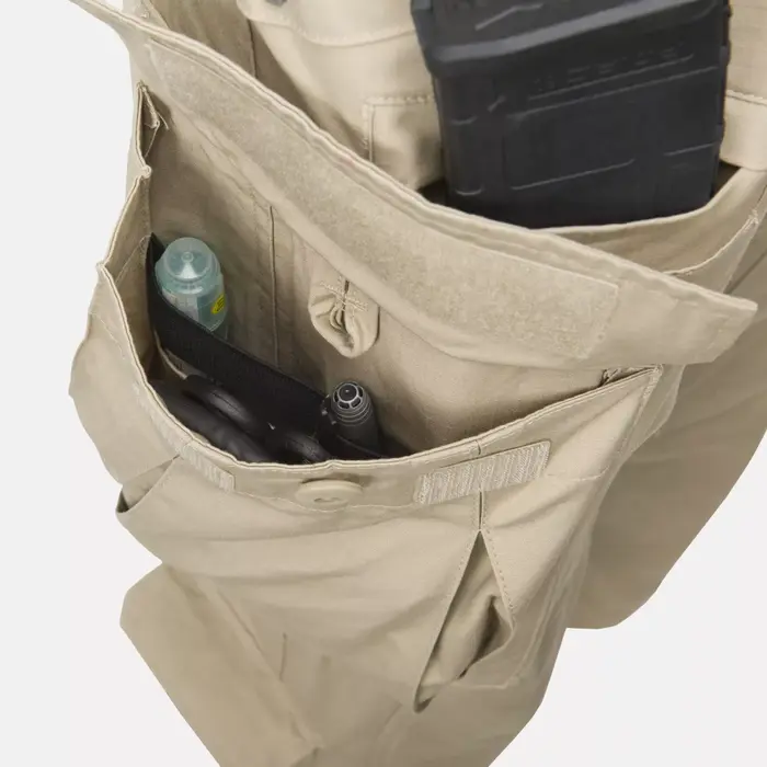 Военные брюки SFU Next имеют девять карманов. Два классических передних кармана, расположенных на бедрах, усилены для снижения риска повреждения от зажимов для ножей или фонариков. Боковые набедренные грузовые карманы, застегивающиеся на липучки и пуговицы, оснащены внутренним органайзером. Это позволяет пользователю оптимально распределить мелкие предметы снаряжения и закрепить их, чтобы они не смещались во время активности. Боевые брюки также имеют дополнительный нагрудный карман, застегивающийся на крючок. петля, в которую легко поместится персональная аптечка первой помощи.
