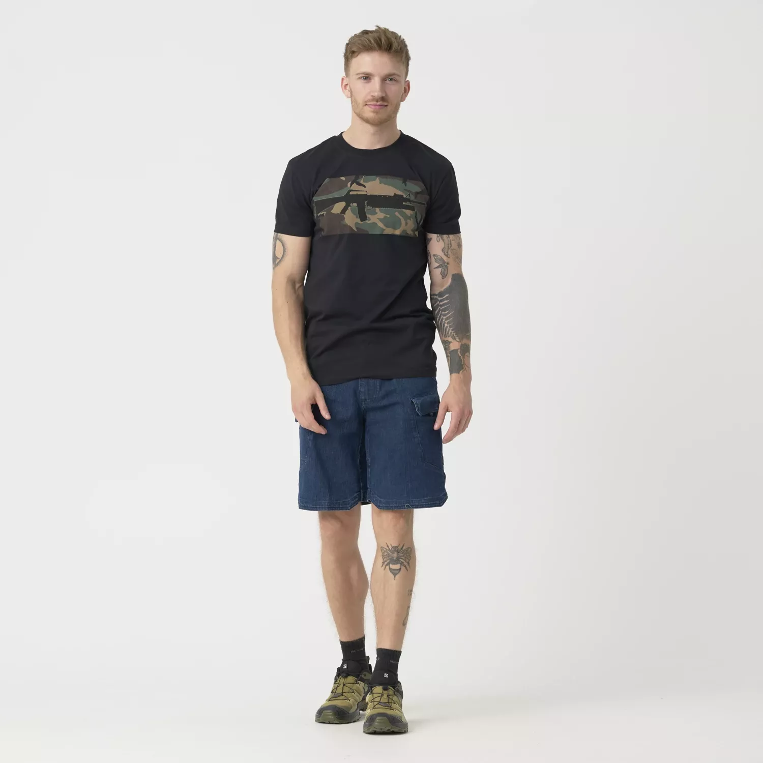 Классическая хлопковая футболка стандартного кроя. Форма винтовки и камуфляж US Woodland напоминают о военных корнях нашей компании. Характерная форма футболок развилась в начале 20-го века из прежнего нижнего белья (известного как комбинезон). После Второй мировой войны хлопковые футболки в форме буквы Т стали очень популярны, отчасти благодаря Марлону Брандо и Джеймсу Дину, которые носили их на экране.