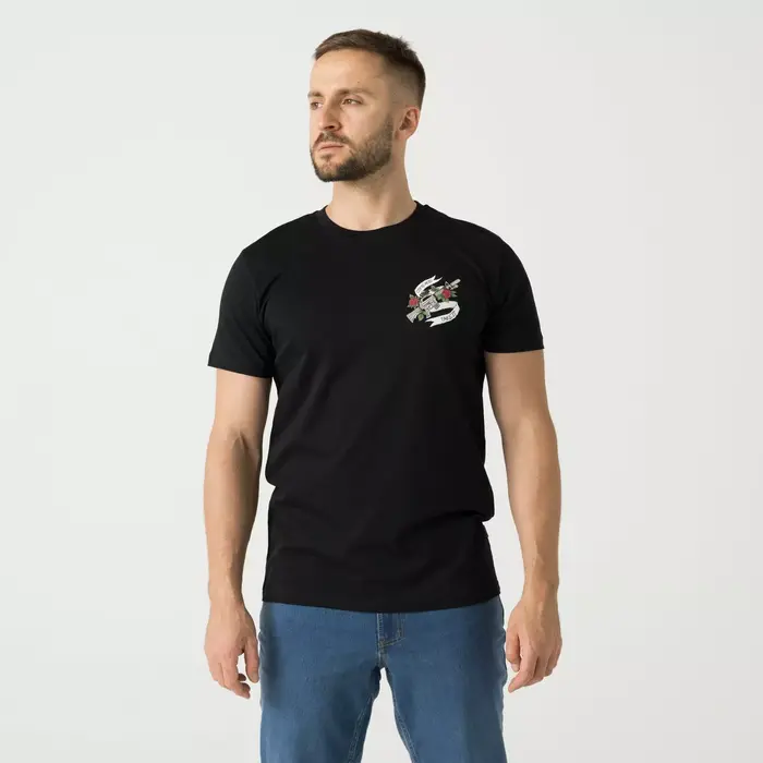 Классическая хлопковая футболка с тактическим мотивом.Отличительная форма футболок развилась в начале 20-го века из предшествующего нижнего белья (известного как комбинезон). После Второй мировой войны хлопковые футболки в форме буквы Т стали очень популярны, отчасти благодаря Марлону Брандо и Джеймсу Дину, которые носили их на экране.