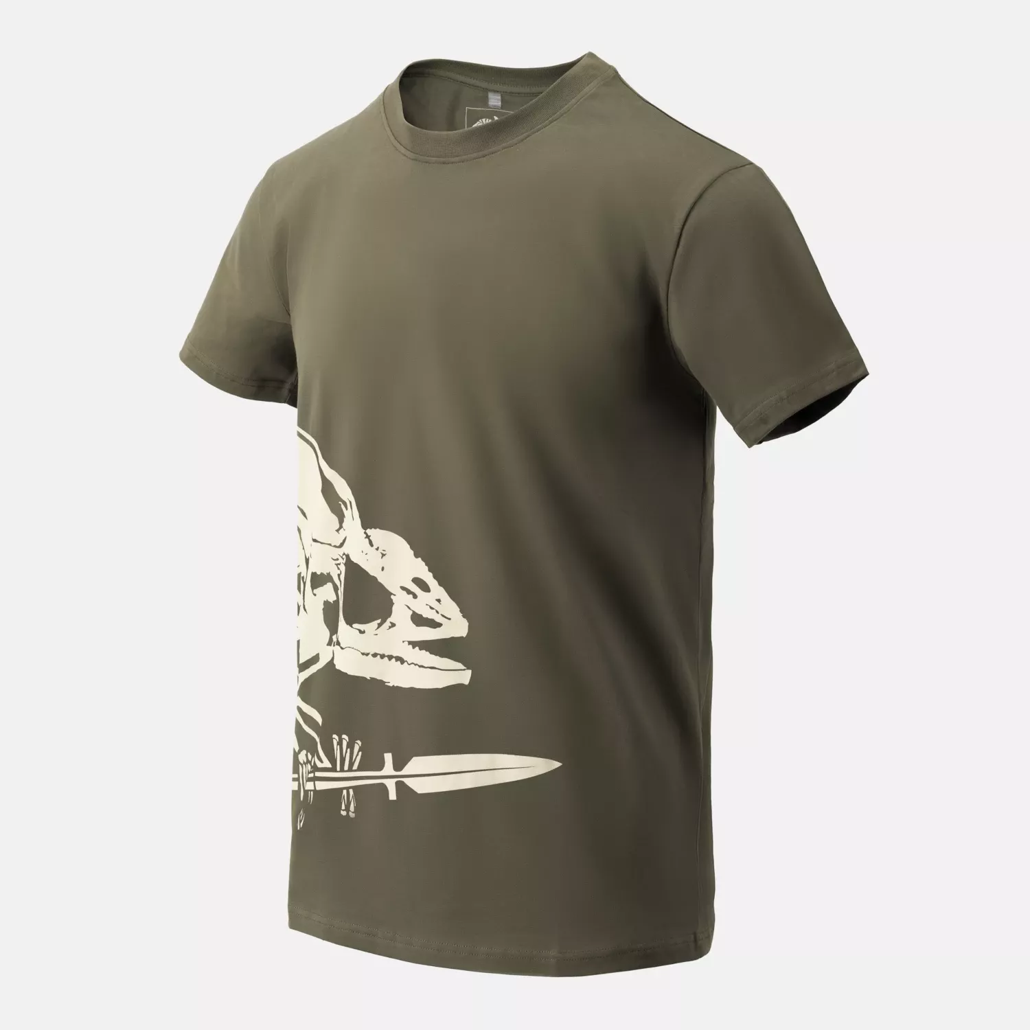 Футболка с принтом скелета хамелеона обязательно найдет место во многих гардеробах. Классический крой и темный цвет делают ее подходящей для повседневной носки — будь то активный отдых на природе или прогулка по городу. Уникальный характер изделия подчеркивается современным, прочным принтом, который выдержит многократную стирку. Рубашка изготовлена из дышащего, мягкого хлопка, обеспечивающего комфорт и свободу движений в любой ситуации.