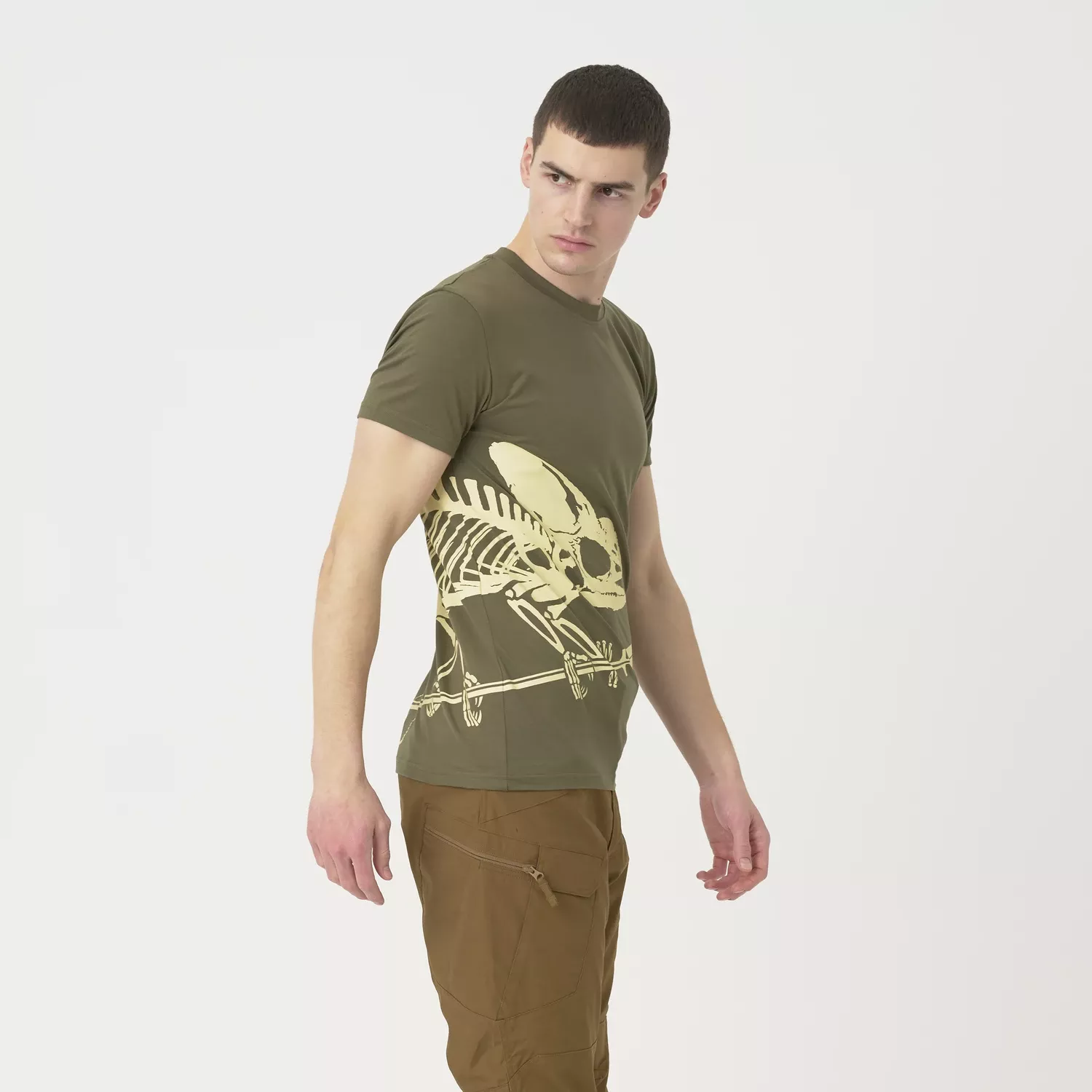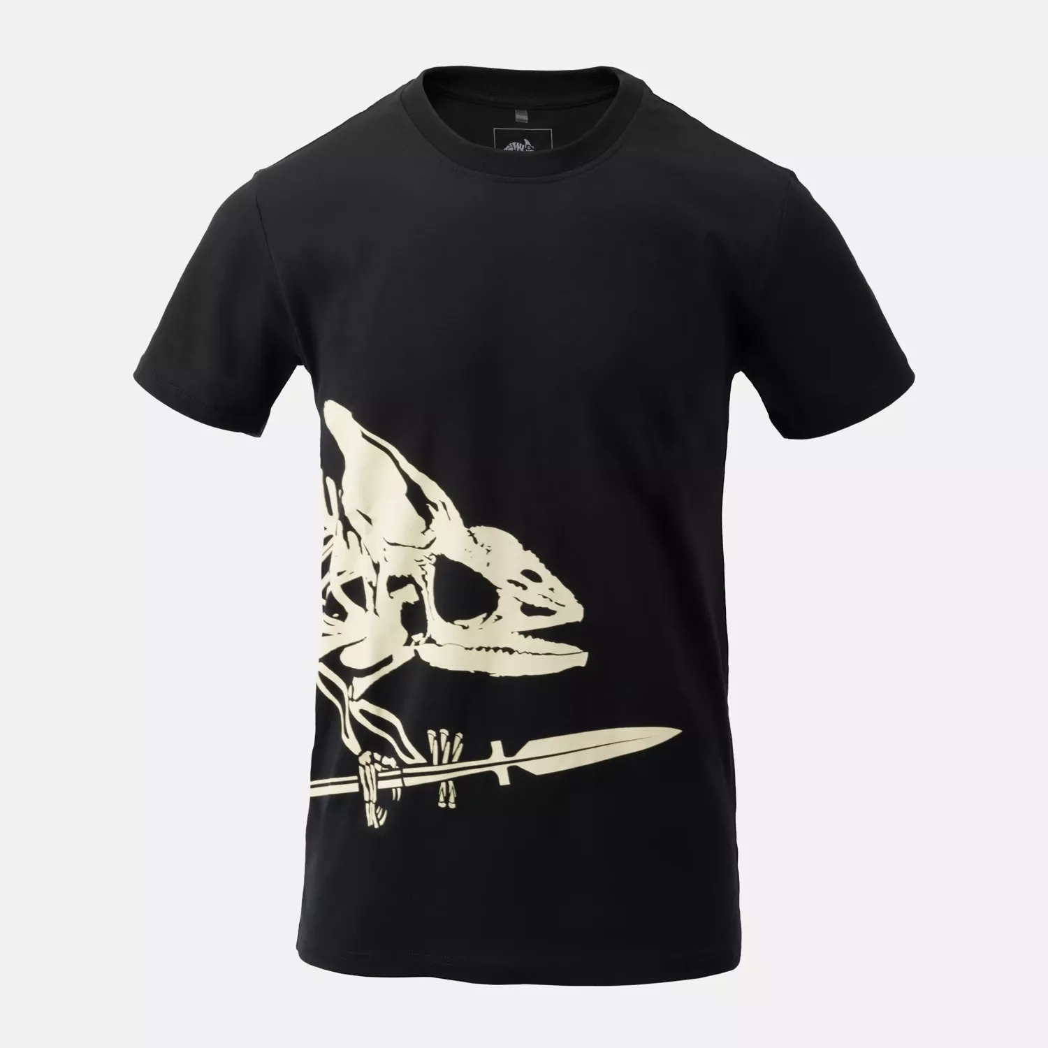 Футболка с принтом скелета хамелеона обязательно найдет место во многих гардеробах. Классический крой и темный цвет делают ее подходящей для повседневной носки — будь то активный отдых на природе или прогулка по городу. Уникальный характер изделия подчеркивается современным, прочным принтом, который выдержит многократную стирку. Рубашка изготовлена из дышащего, мягкого хлопка, обеспечивающего комфорт и свободу движений в любой ситуации.