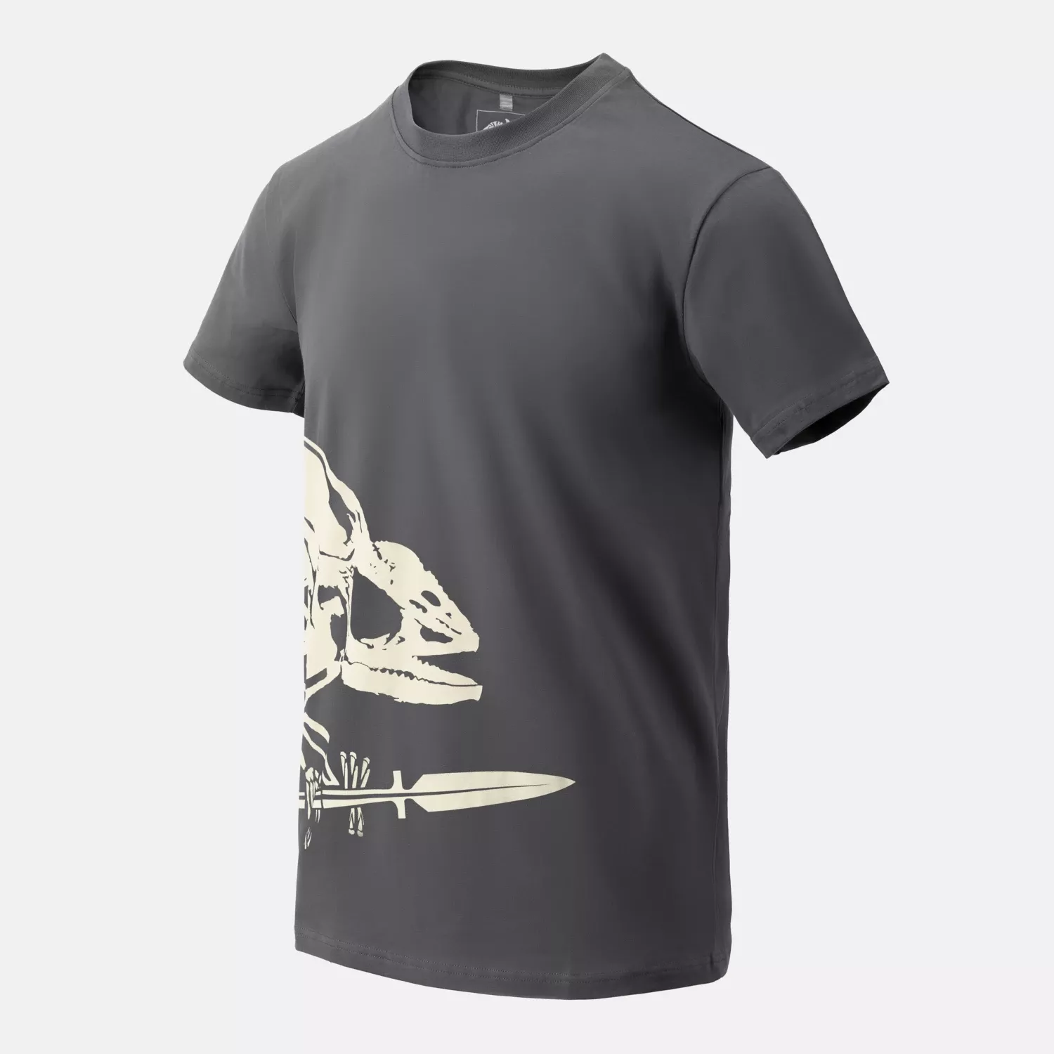 Футболка с принтом скелета хамелеона обязательно найдет место во многих гардеробах. Классический крой и темный цвет делают ее подходящей для повседневной носки — будь то активный отдых на природе или прогулка по городу. Уникальный характер изделия подчеркивается современным, прочным принтом, который выдержит многократную стирку. Рубашка изготовлена из дышащего, мягкого хлопка, обеспечивающего комфорт и свободу движений в любой ситуации.