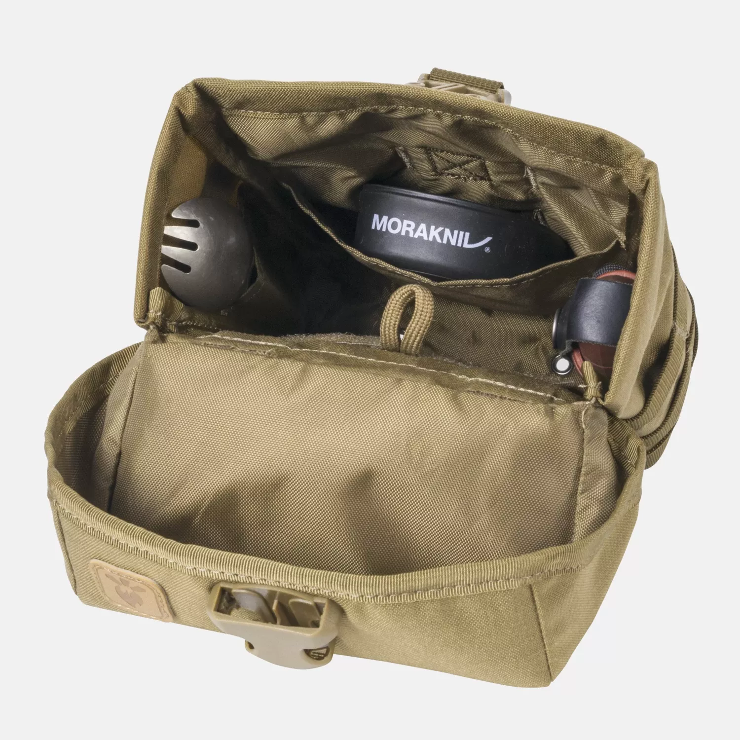 Внутри основного отделения есть два небольших кармана и один большой карман с застежкой-липучкой, подходящий для крепления вставок и адаптеров. Подсумок также имеет петлю для крепления мелких предметов, таких как ключи. Он закрывается удобной широкой пряжкой.