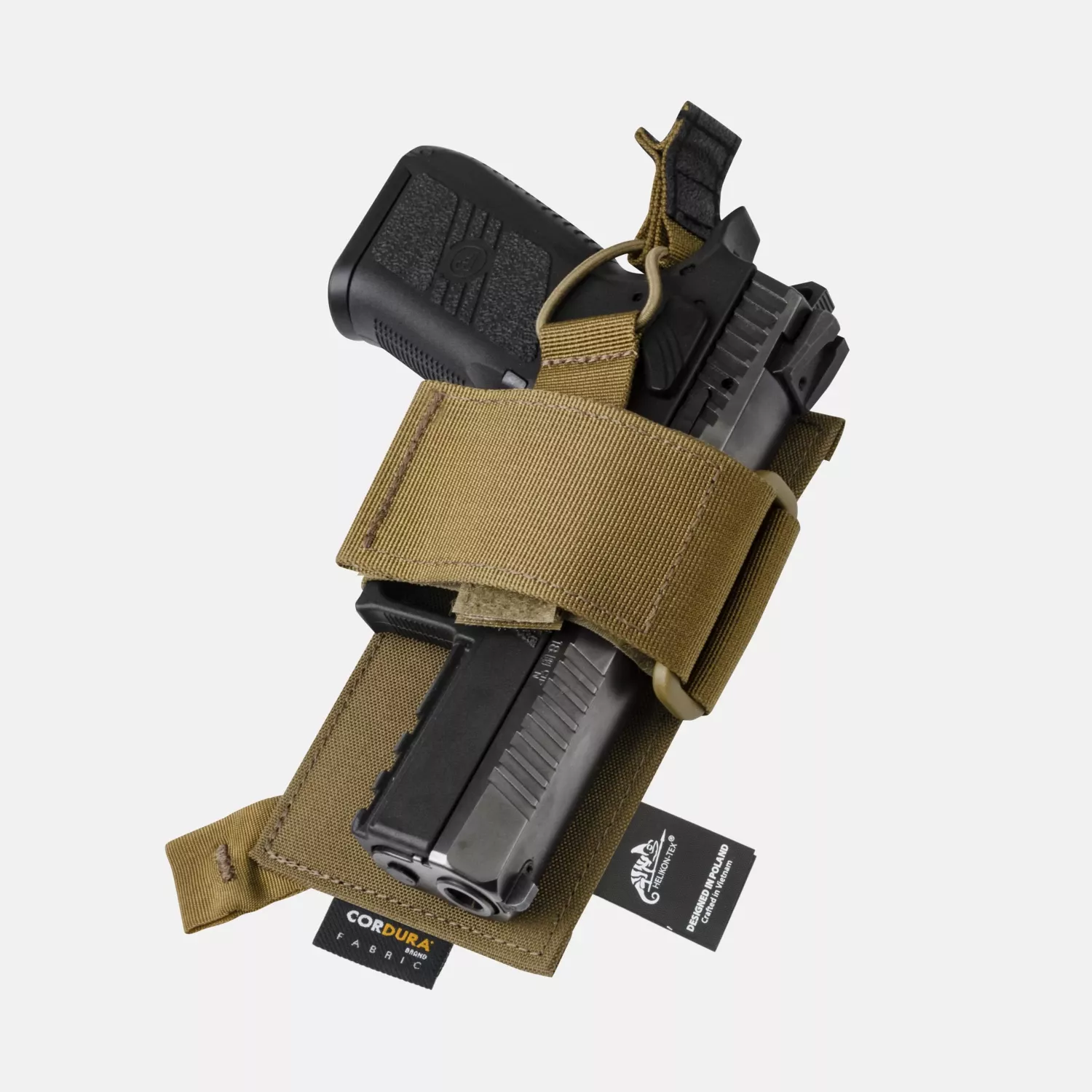 Легкая кобура позволяет безопасно и незаметно носить пистолет в поясной сумке, рюкзаке или сумке. Мобильная вставка для оружия совместима с полноразмерными пистолетами, такими как Glock 17, XDM, CZ P07/09, SIG 226 или P99. Оружие надежно фиксируется во время транспортировки эластичной нескользящей рукояткой, которая позволяет устанавливать его в любом положении, даже вверх ногами. Ключевым преимуществом кобуры военного класса является ее исключительная прочность, гарантированная материалом Cordura, полностью изготовленным из нейлоновых волокон — прочным и устойчивым к истиранию и разрывам. Продуманная конструкция облегчает использование армейской кобуры Insert Inverted Pistol Holder.