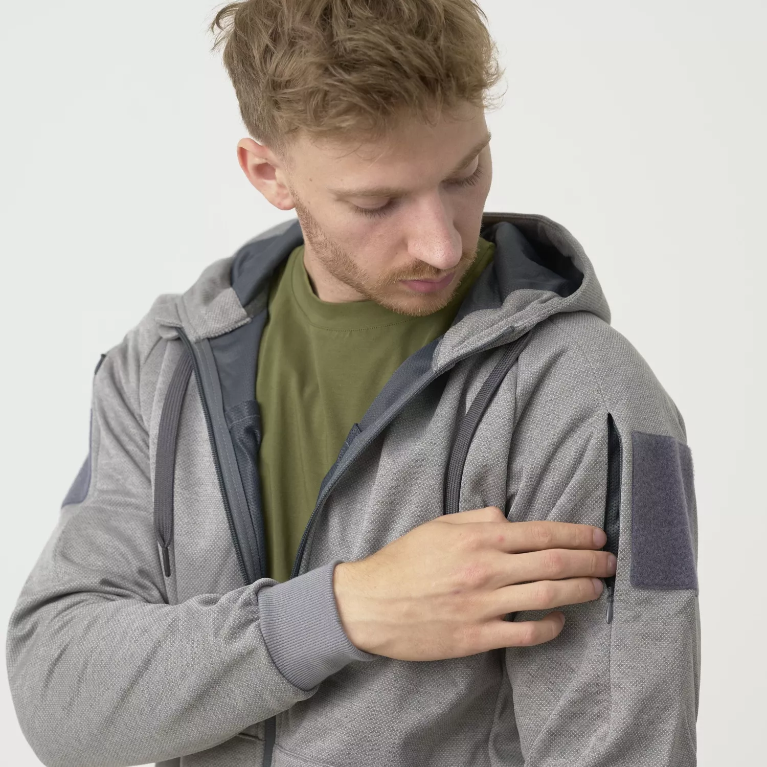 На плечах и нижней части капюшона пришиты панели на липучках, позволяющие легко персонализировать толстовку, прикрепляя эмблемы или нашивки. Капюшон регулируется и имеет дополнительную застежку-липучку. Панель с петлей, расширяющая ее функциональность. Высокая застежка-молния защищает шею и лицо от холода и других неблагоприятных погодных условий.