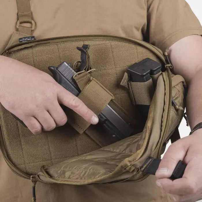 Рюкзак EDC Sling имеет три кармана. Спереди расположены два кармана – один с застежкой-пряжкой, другой на молнии, – а также третий небольшой эластичный карман на молнии, вшитый в лямку на уровне груди. Кроме того, рюкзак имеет два внутренних отделения, оба отделаны мягким велюром. Это делает их совместимыми с нашими вкладышами из системы VIS (Versatile Insert System), что позволяет гибко настраивать внутреннее пространство. В то время как первое отделение является стандартным, второе, расположенное сзади, специально разработано для незаметного ношения оружия и имеет ручку из гипалона для легкого доступа – его можно открыть плавным движением. Хотя рюкзак EDC Sling был разработан как тактический рюкзак, его сдержанный внешний вид и дизайн позволяют использовать его и в гражданских целях, например, в качестве туристического рюкзака для осмотра достопримечательностей или пеших прогулок.