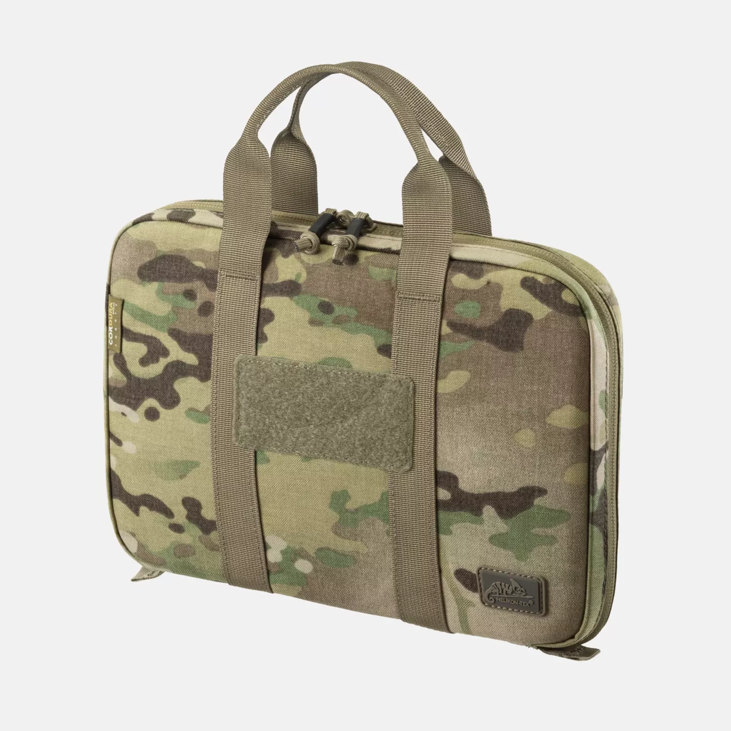 Чехол для одного пистолета — это прочный чехол, который защищает ваше огнестрельное оружие во время движения (например, на стрельбище). Его легко носить за две ручки. Он оснащен молнией YKK, а внутренняя панель предотвращает удар оружия о молнию. Этот нейлоновый чехол вмещает один полноразмерный пистолет или револьвер, а также два магазина. Вы также можете прикрепить дополнительные органайзеры, используя подкладку с липучкой, совместимую с универсальной системой вставок. Панель на липучке для нашивок позволяет персонализировать чехол. Этот оружейный кейс обеспечивает безопасную транспортировку и защищает содержимое.