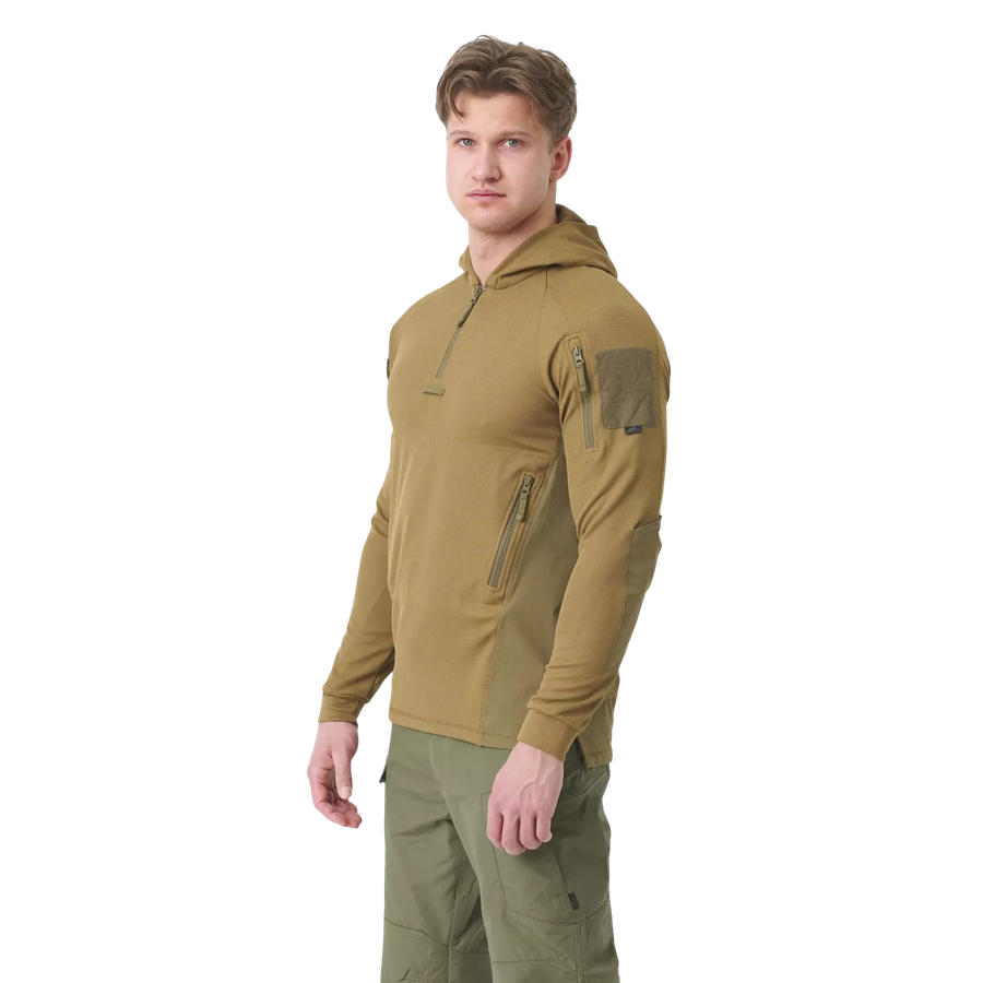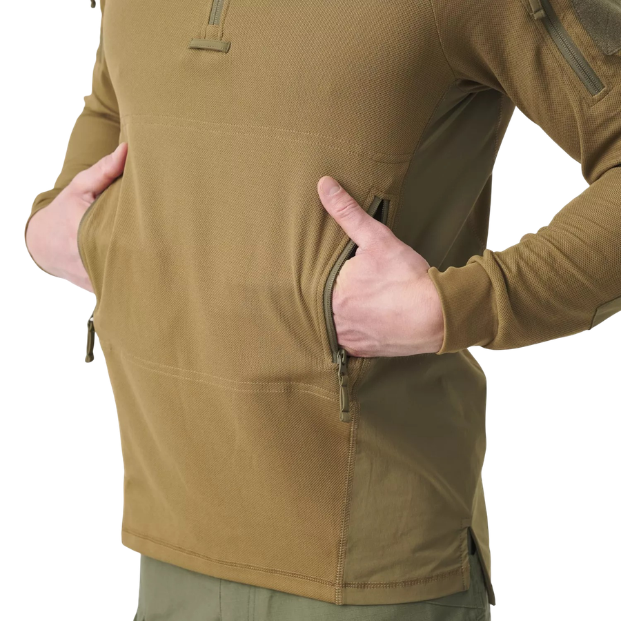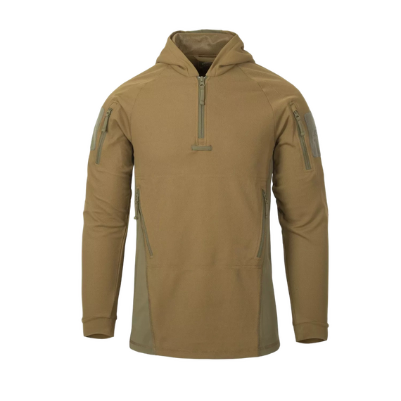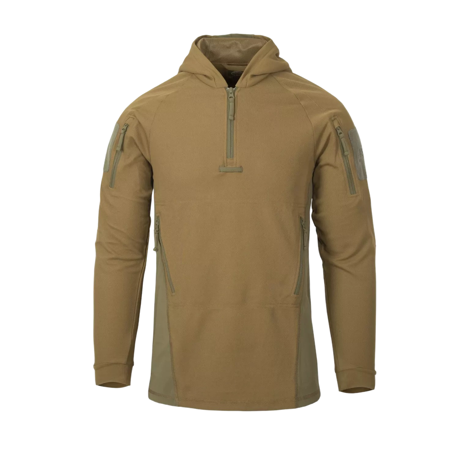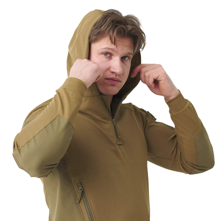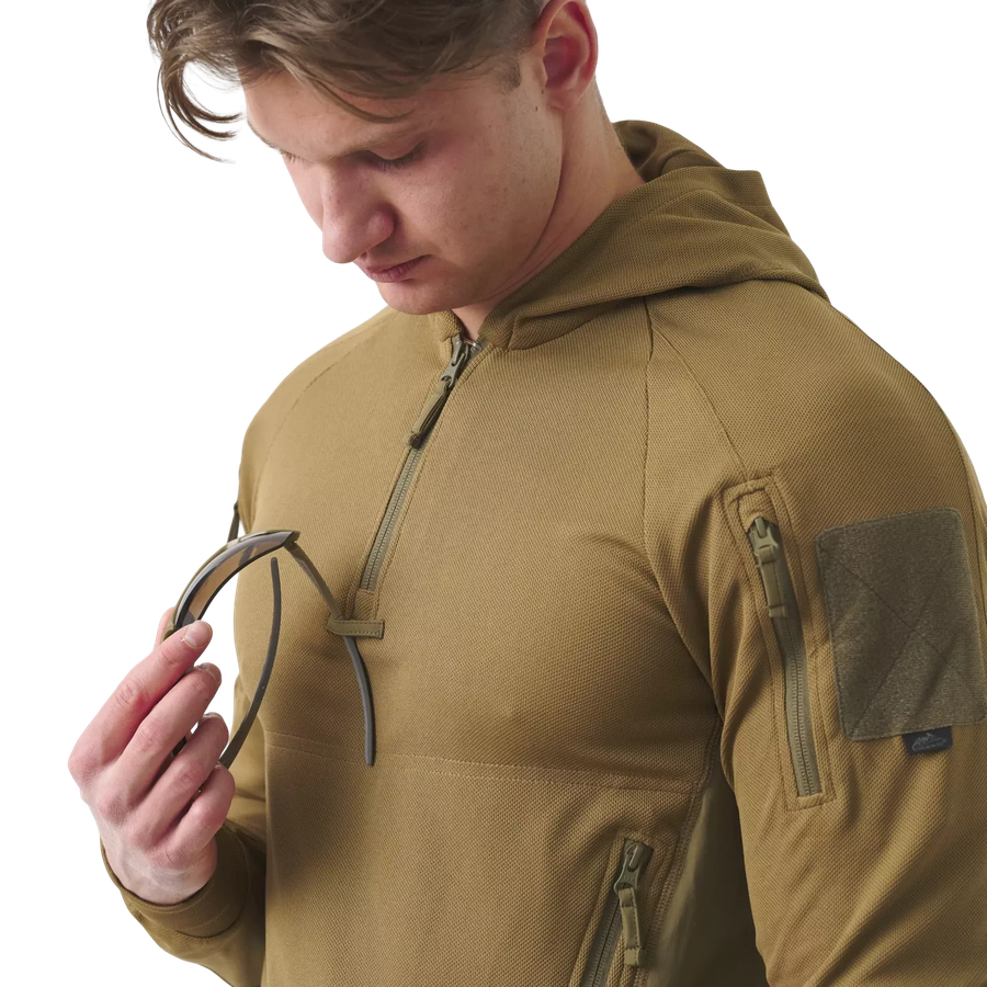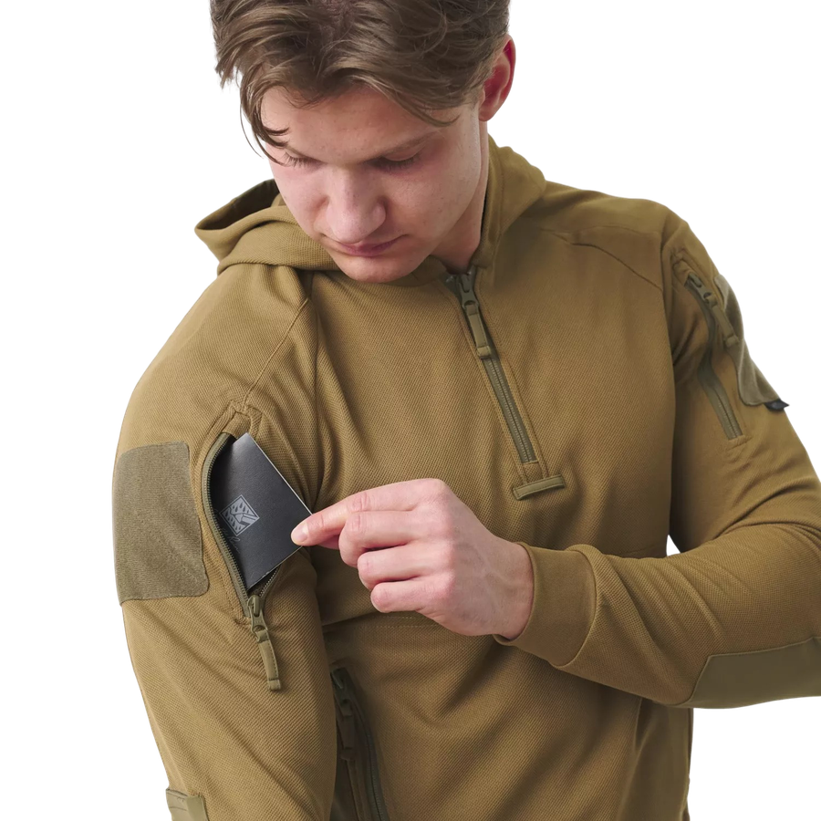 Range Hoodie — лёгкая и функциональная толстовка, разработанная для тренировок на стрельбище и активного отдыха. Изготовлена из устойчивого к износу полиэстера и эластичной ткани Versastretch, быстро сохнет и отводит влагу благодаря материалу TopCool. Анатомически сформированный, регулируемый капюшон и удлинённый крой обеспечивают комфорт в сложных условиях. Толстовка оснащена карманом‑кенгуру с молниями YKK, карманами на плечах с велкро‑панелями для патчей и внутренними сетчатыми карманами для вентиляции. Усиленные локти содержат скрытые карманы для защитных накладок, что делает Range Hoodie универсальной для всех сезонов. Вес изделия около 480 г.