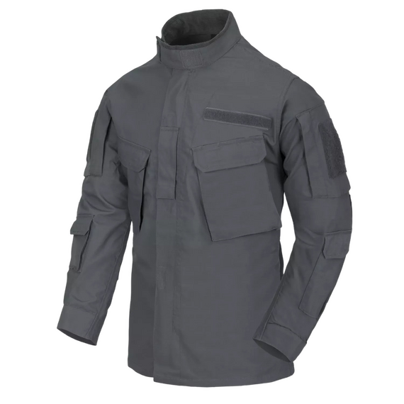 Военная футболка с высоким воротом оснащена множеством инновационных элементов, таких как отверстия для крепления фонарей, специальные карманы для защиты и молнии YKK, обеспечивающие доступ к переносимому снаряжению. Существенным преимуществом военной полевой куртки является наличие шести карманов, которые закрываются на липучки или молнии и расположены как спереди, так и на плечах.