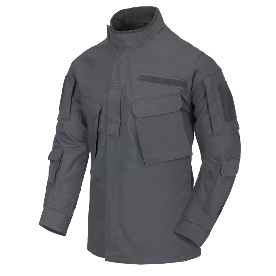 Военная футболка с высоким воротом оснащена множеством инновационных элементов, таких как отверстия для крепления фонарей, специальные карманы для защиты и молнии YKK, обеспечивающие доступ к переносимому снаряжению. Существенным преимуществом военной полевой куртки является наличие шести карманов, которые закрываются на липучки или молнии и расположены как спереди, так и на плечах.
