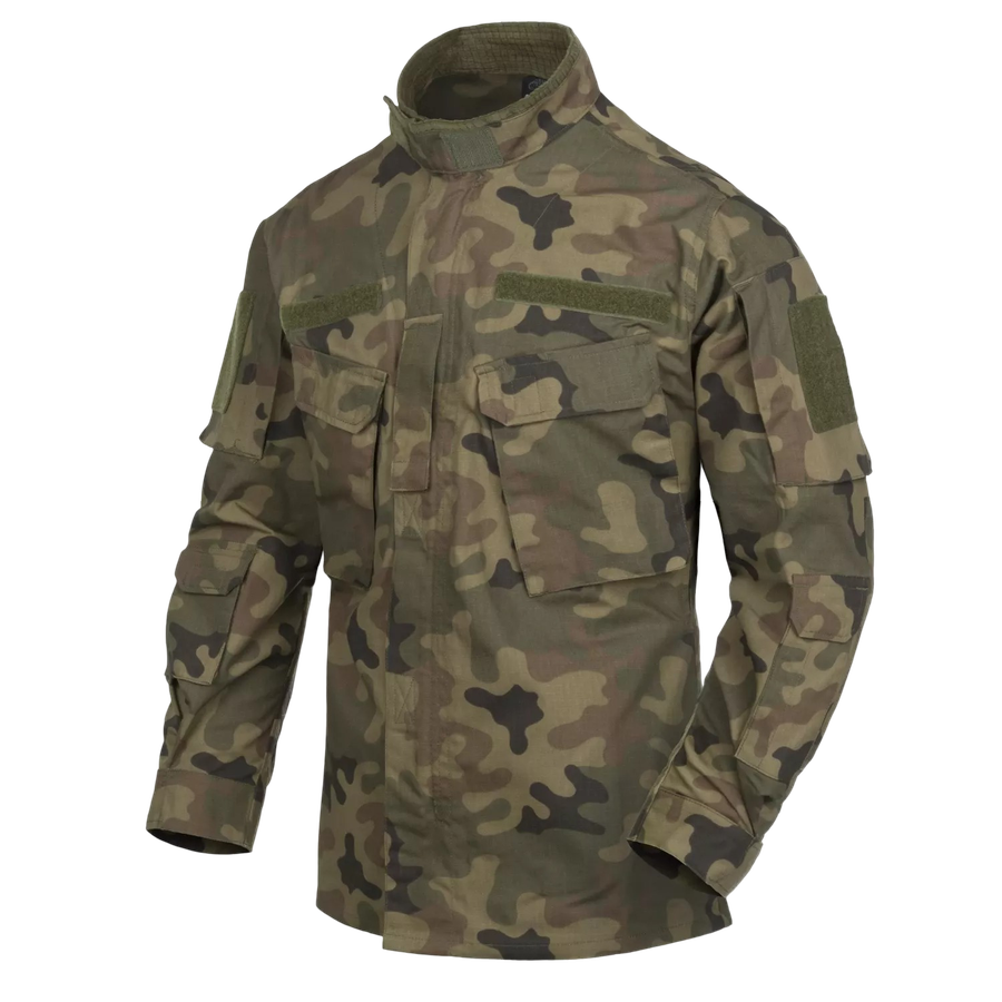 Военная футболка с высоким воротом оснащена множеством инновационных элементов, таких как отверстия для крепления фонарей, специальные карманы для защиты и молнии YKK, обеспечивающие доступ к переносимому снаряжению. Существенным преимуществом военной полевой куртки является наличие шести карманов, которые закрываются на липучки или молнии и расположены как спереди, так и на плечах.