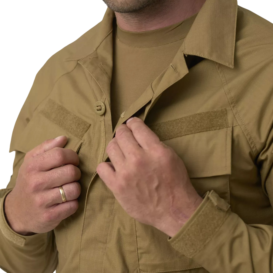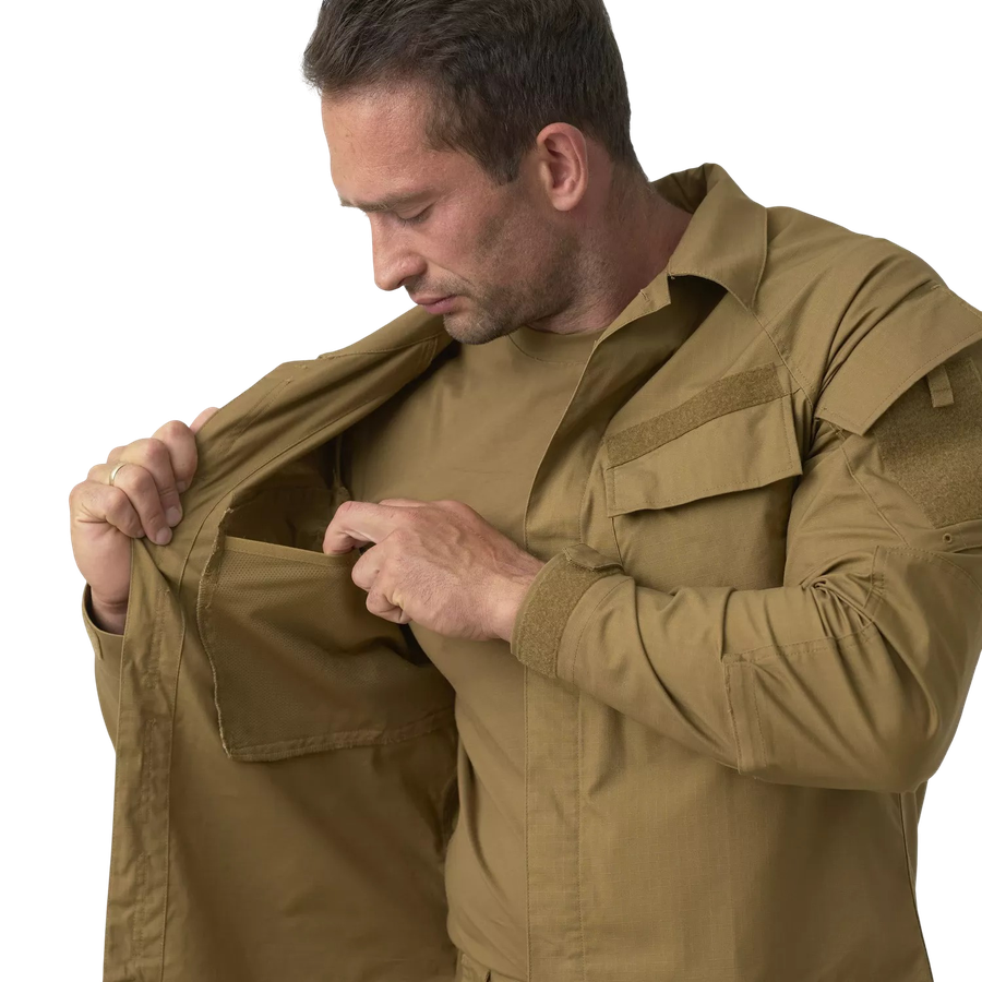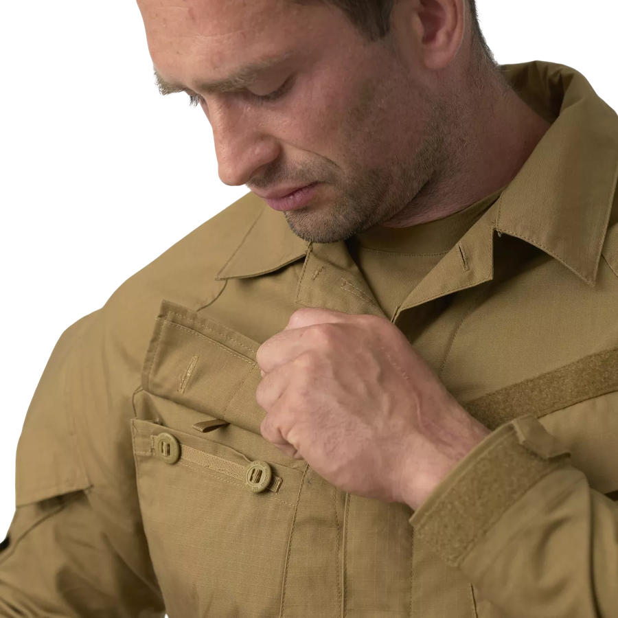 Рубашка Raid — это классика в новом исполнении. Она полностью изготовлена из поликоттона стрейч рипстоп (48 % хлопка, 50 % полиэстера, 2 % эластана), что делает ее слегка эластичной и обеспечивает большую свободу движений. Эта модель имеет удобную конструкцию реглан. Такой крой редко встречается в униформе, но он был принят на вооружение в армии США. Последняя военная форма США, IHWCU (улучшенная боевая форма для жаркой погоды), также имеет конструкцию реглан.