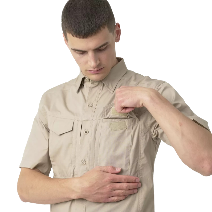 Короткорукавная версия рубашки Defender Mk2 для жаркой погоды. Сшита из прочной смеси полиэстера и хлопка с рипстоп-переплетением (58% хлопок, 40% полиэстер, 2% эластан). Эластичные вставки обеспечивают свободу движений, а петля для очков и два нагрудных кармана повышают функциональность. Вентиляционные каналы помогают сохранять комфорт. Подходит для стрельбы, работы или повседневной носки.