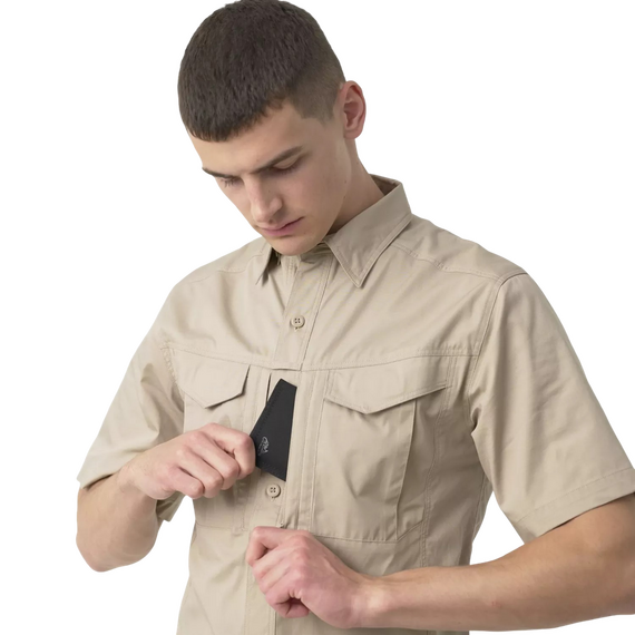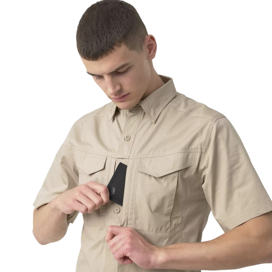 Короткорукавная версия рубашки Defender Mk2 для жаркой погоды. Сшита из прочной смеси полиэстера и хлопка с рипстоп-переплетением (58% хлопок, 40% полиэстер, 2% эластан). Эластичные вставки обеспечивают свободу движений, а петля для очков и два нагрудных кармана повышают функциональность. Вентиляционные каналы помогают сохранять комфорт. Подходит для стрельбы, работы или повседневной носки.