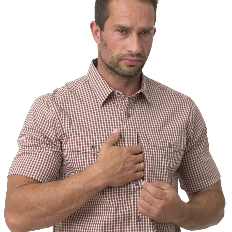 Клетчатая рубашка Concealed Carry отличается несколькими практичными решениями. Два нагрудных кармана и один потайной карман на молнии обеспечивают безопасное хранение ценных вещей. Она также оснащена уникальной системой застёжек, которые выглядят как пуговицы, но на самом деле являются кнопками, позволяющими мгновенно получить доступ к огнестрельному оружию, магазинам, телескопической дубинке и другим полезным аксессуарам, которые можно носить под рубашкой. Дополнительной деталью является нашивка из микрофибры, пришитая изнутри и полезная для чистки очков.